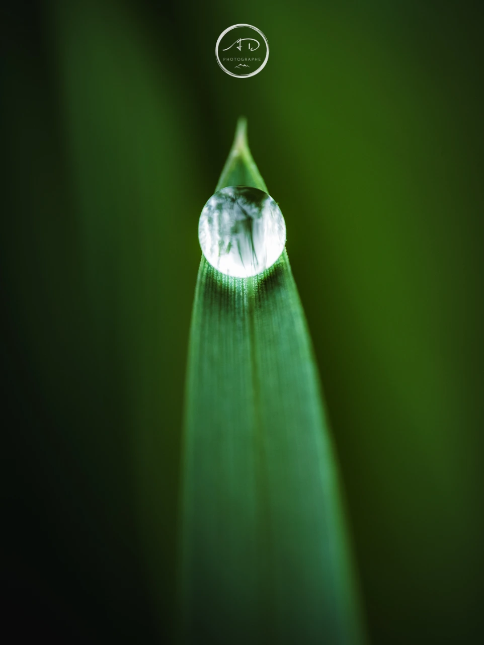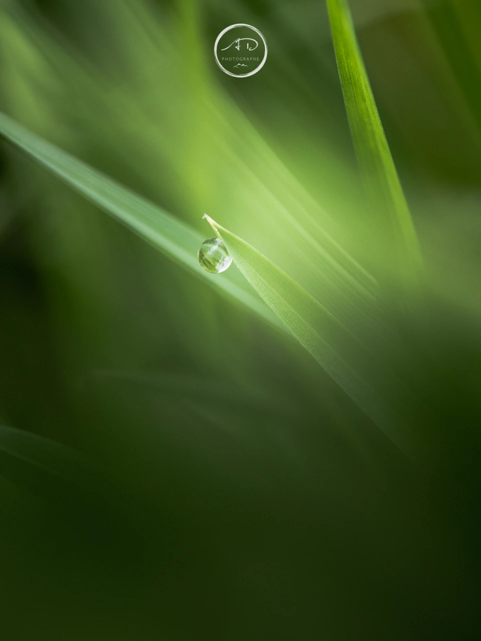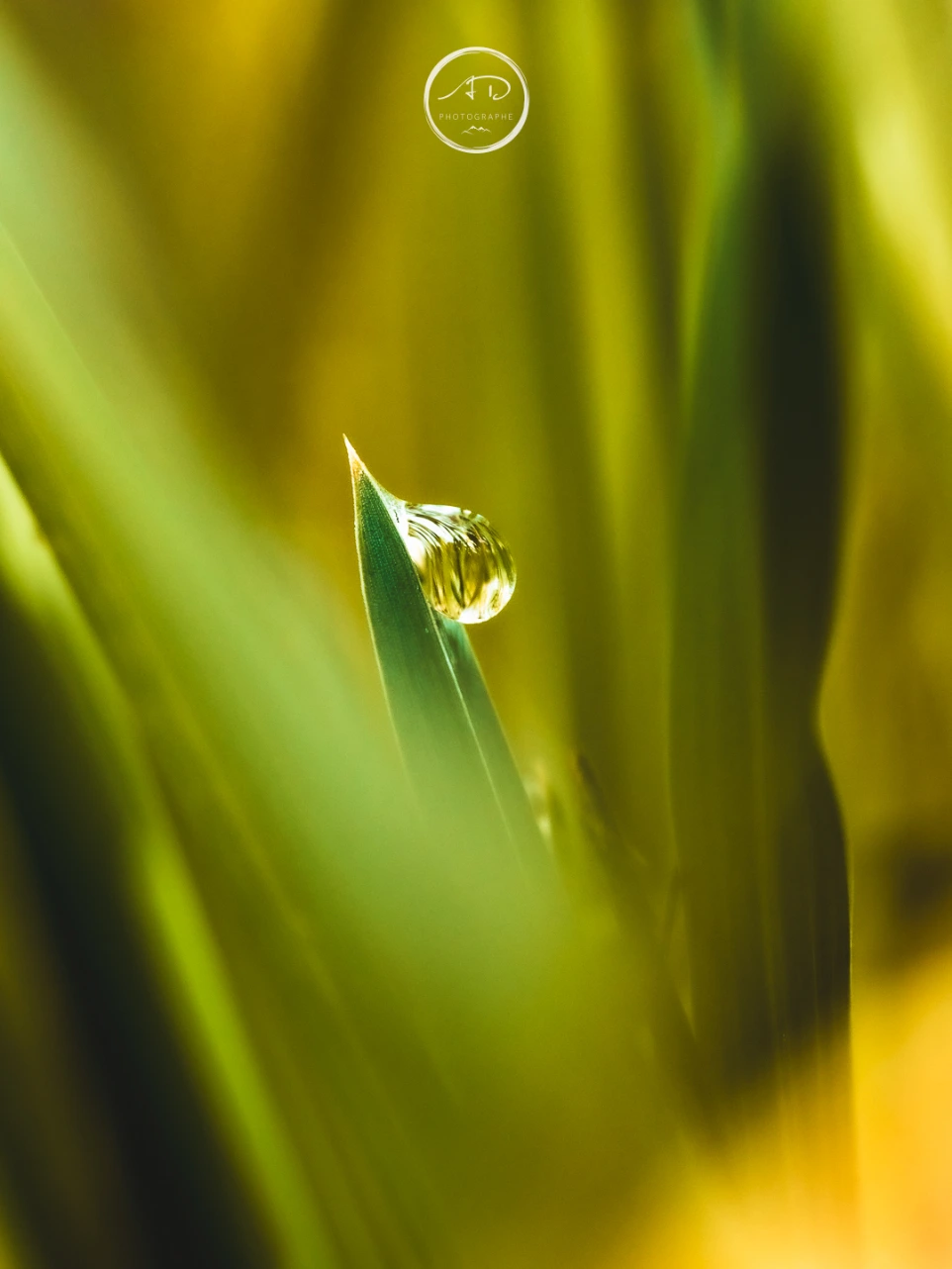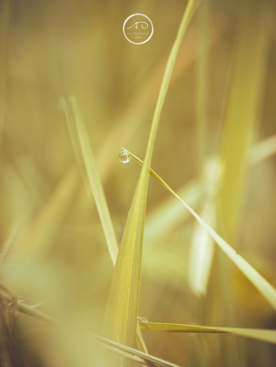 Accroupi dans l’herbe haute, je pars à la recherche de la goutte qui me donne l’inspiration. J’en vois plein et à travers la mise au point AF de l’objectif, positionnée en mode macro, je m’aperçois de la beauté des lieux. Le bokeh généré par la profondeur de champ réduite me fait rêver. Et à un moment donné, je trouve cette goutte sublimée par cette lumière subtile. Elle est parfaite, je ne la quitte pas des yeux. C'est la dernière goutte avant qu'elle ne s'évapore au cours de la journée.